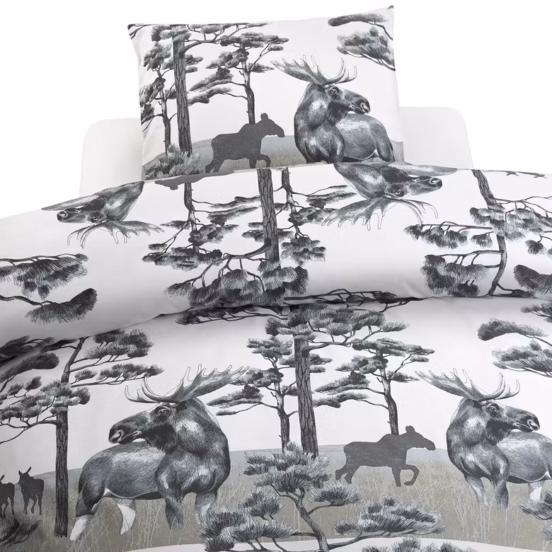 Ge sovrummet en rogivande känsla med Älg i skogen Grå bäddset från Borganäs of Sweden. Det stilrena älgmotivet i grå toner på vit botten skapar en fridfull atmo
