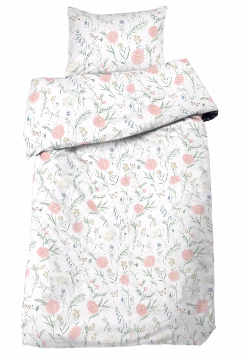 Romantiskt bäddset i mjuk bomull med blommor, fjärilar och trollsländor i rosa, gula och blå toner – en somrig våräng för sovrummet.