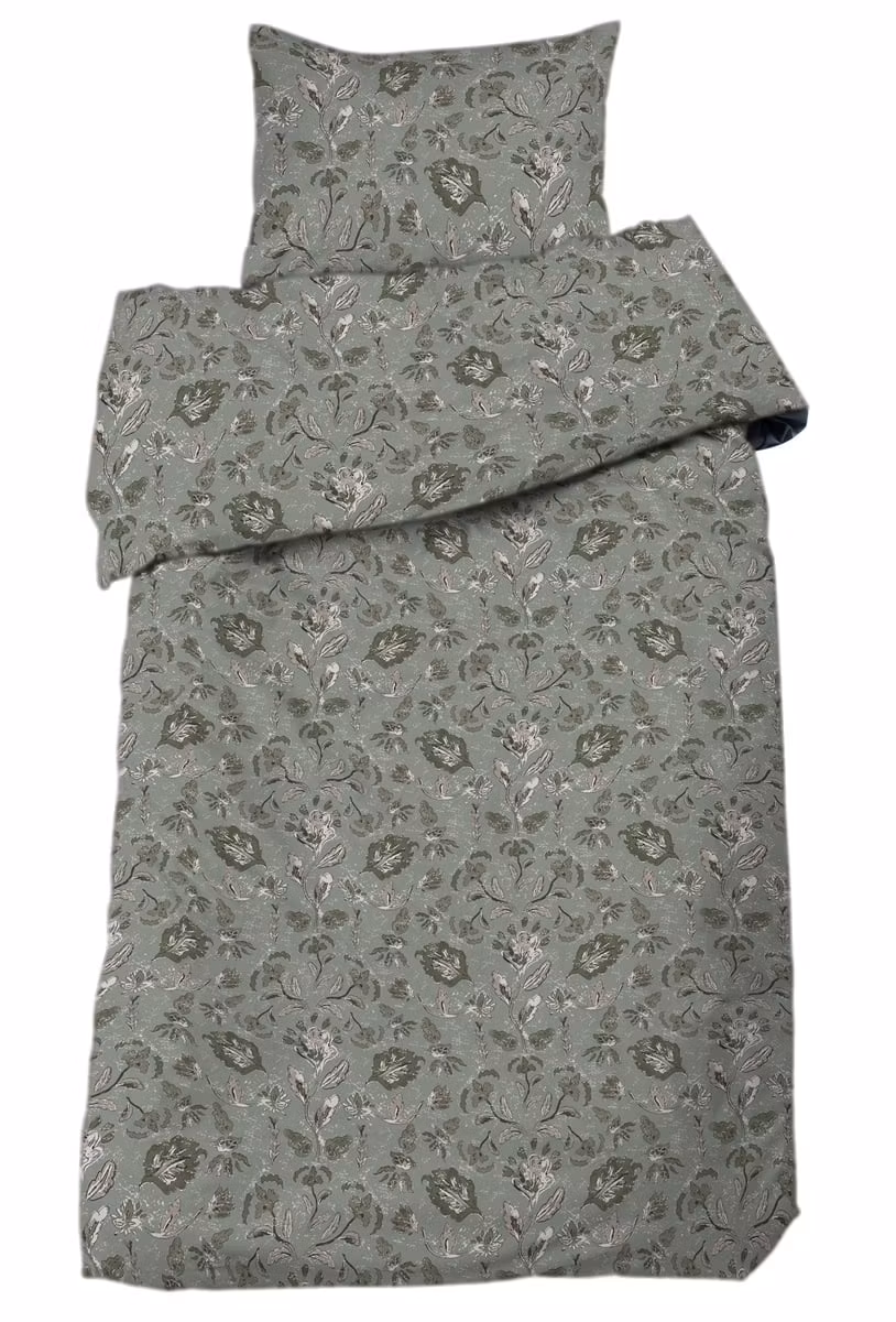 Det vackra botaniska mönstret i dova gröna nyanser ger en naturlig och harmonisk atmosfär, samtidigt som satinen tillför en silkeslen yta och mjuk glans.