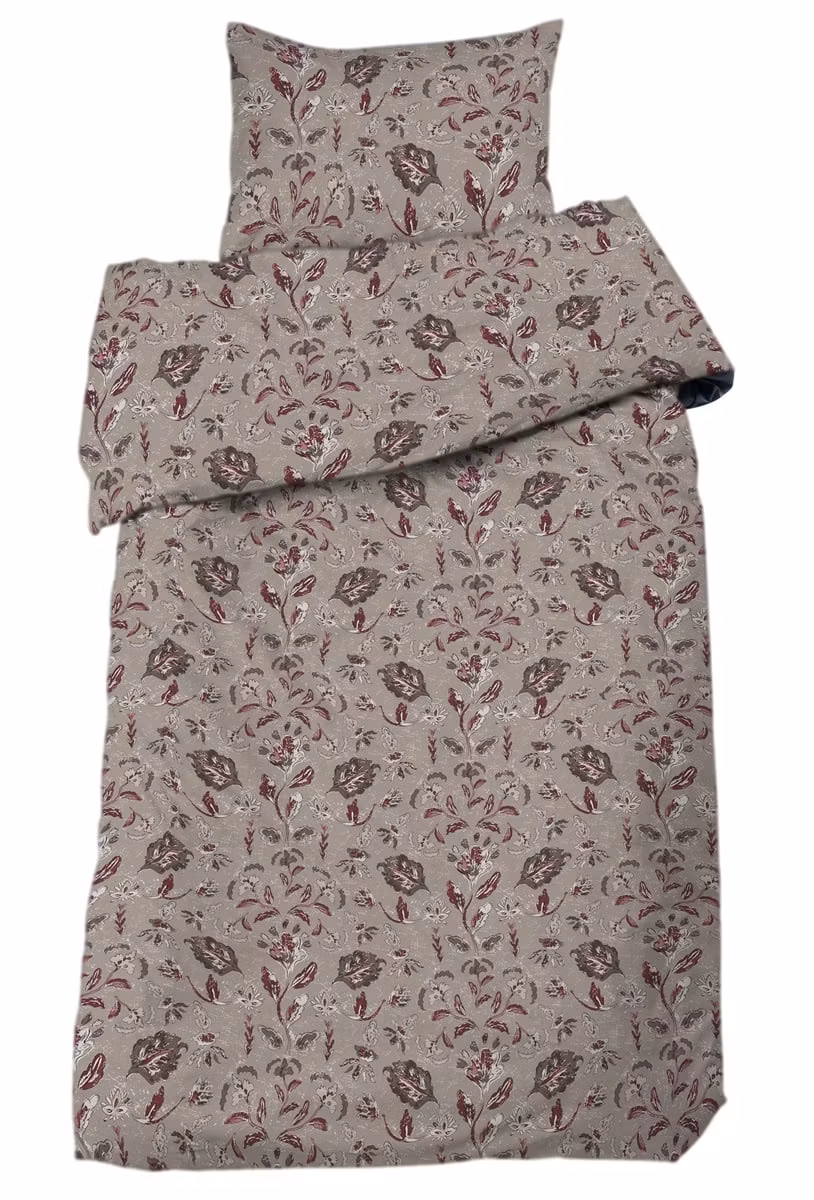Ingela Satin Mullvad bäddset 150x210 cm från Redlunds – lyxig bomullssatin med elegant mönster i mullvads- och vinröda toner.