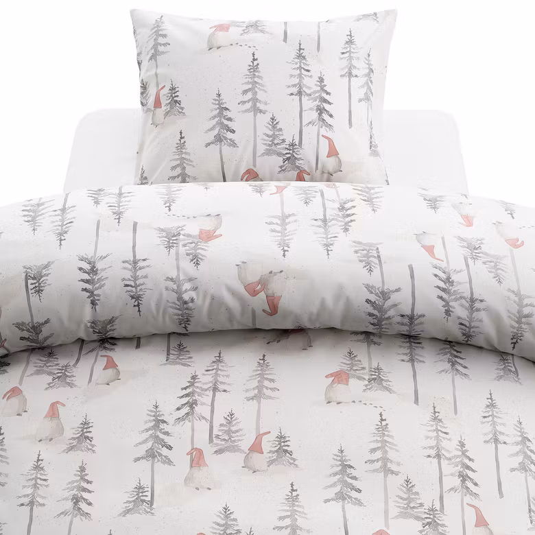 Bädda in sovrummet i julens härliga stämning med Bäddset Skogstomte Vit/Grå från Borganäs of Sweden.