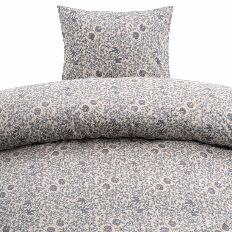 Botanique Blå bäddset från Borganäs of Sweden i 100 % bomull med naturnära blommönster i blått och beige. OEKO-TEX MADE IN GREEN.