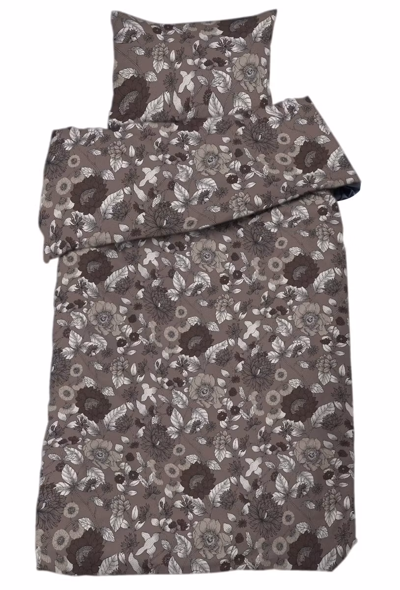 Blommigt bäddset i 100 % bomull med dova hösttoner i mullvad – ett elegant och ombonat val som ger sovrummet värme och liv.