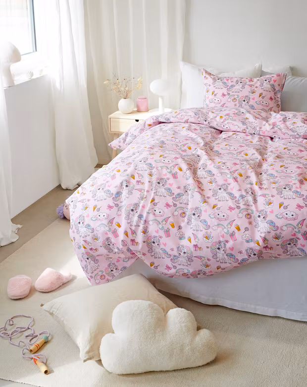 Med Enhörning Rosa bäddset från Borganäs of Sweden får du ett mjukt, färgglatt och fantasifullt sängset som gör att läggdags blir något barnet ser fram emot. Låt de magiska enhörningarna ta med barnet på drömmarnas mest glittrande äventyr – varje natt!
