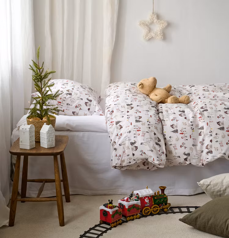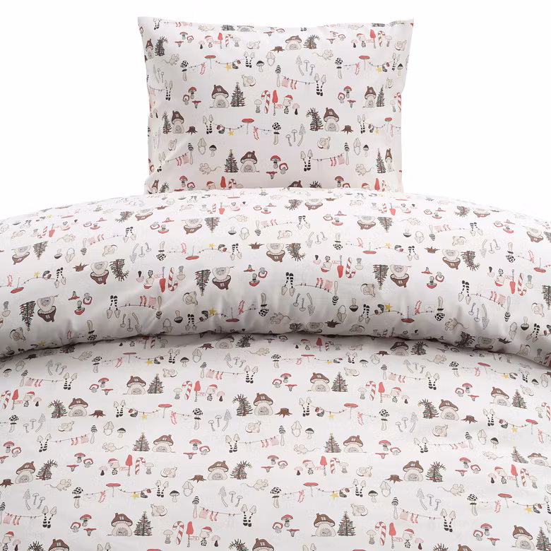 Fingal Jul Bäddset – mysigt påslakanset i 100% bomull med juliga svampar i pastell. Mjukt, hållbart och perfekt för en stämningsfull vinterbäddning.