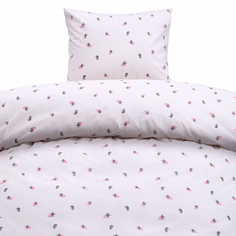 Jordgubbsdröm Röd kännetecknas av sin lekfulla men stilrena design. De små jordgubbarna ger ett livfullt uttryck samtidigt som den ljusa bottenfärgen gör bäddsetet lätt att kombinera med andra textilier och färger i sovrummet.