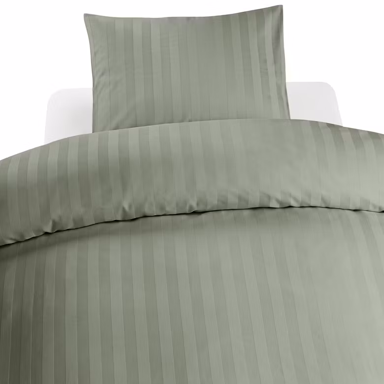 Påslakanet och örngottet är vävda med vertikala matta och blanka ränder som ger en subtil glans och vacker struktur. De diskreta ränderna fångar ljuset och ger en snygg hotellinspirerad look. Den gröna nyansen lyfter inredningen och skapar en naturligt lugnande atmosfär i rummet.