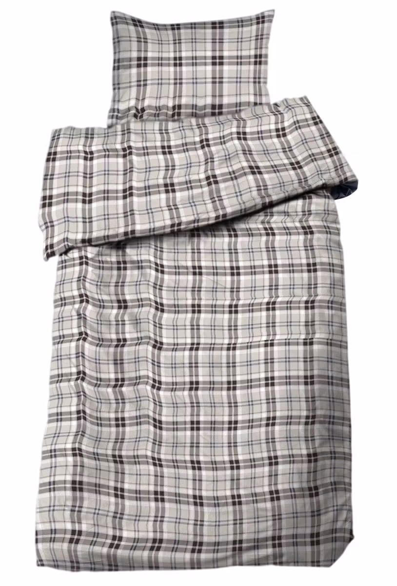 Mjukt och värmande flanellbäddset i blå och beige rutor som skapar en klassisk, ombonad känsla – perfekt för kalla nätter och extra komfort.